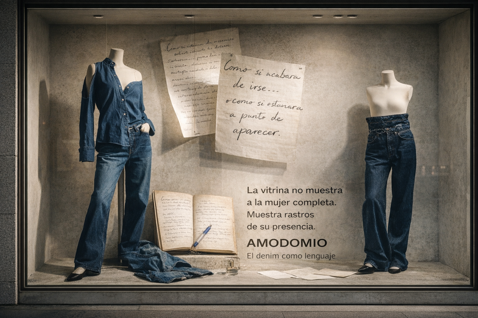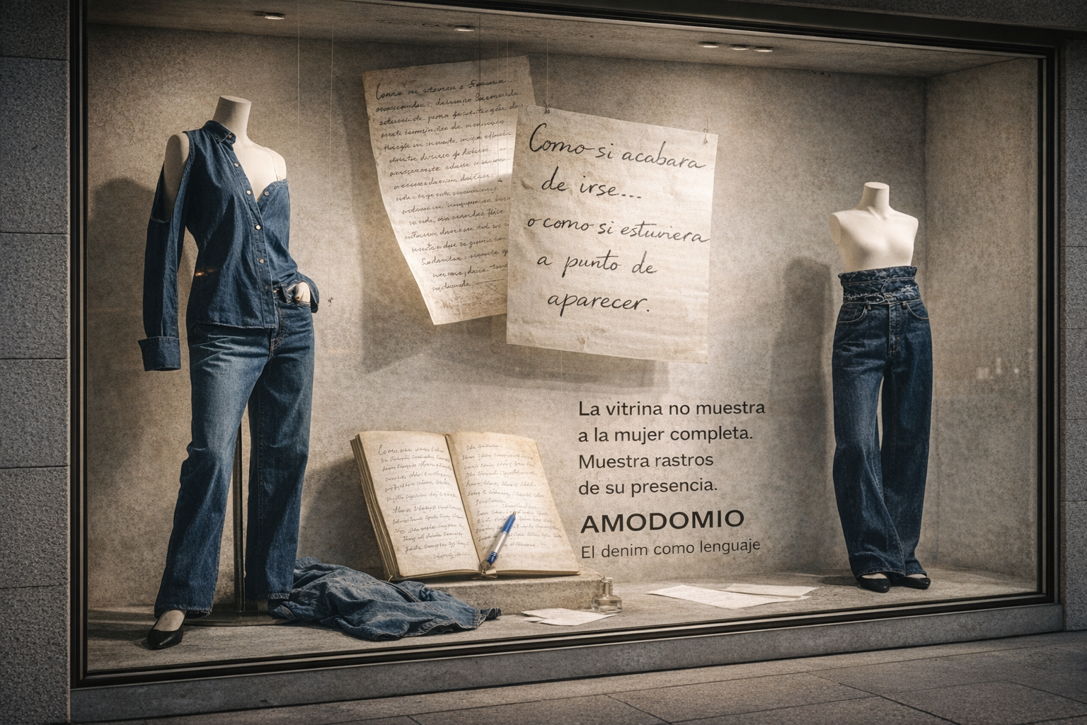 La vitrina funciona como una página abierta: el denim escribe, el cuerpo habla, la ausencia dice tanto como la presencia. No hay un rostro, porque no hay una identidad fija. Hay fragmentos, huellas, silencios.
